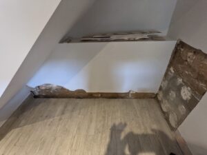 Internal: Finally the treated areas were finished with a multi-finish plaster and existing skirting boards reinstated leaving the area ready to be decorated. All rubbish was removed.