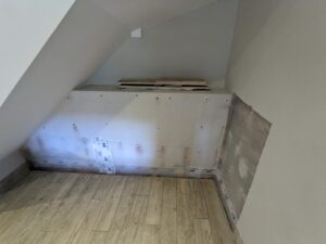 Internal: Removing all the skirting boards and preparation of walls by way of removing affected plaster to 1 meter high in the dining area ready for the waterproof membrane installation.