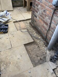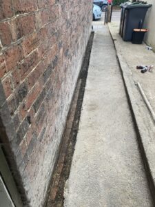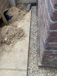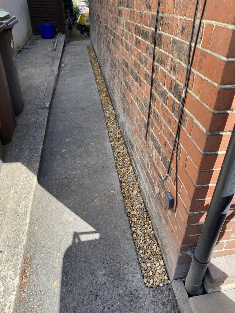 Following the damp inspection Neil submitted his report to Mr E stating raised ground levels externally and the inadequate drainage around the perimeter of the property were causing the rising damp internally. Neil recommended the installation of a french drain which will prevent water and moisture travelling across the current damp proof course (DPC) and a damp proof membrane to the internal dining room wall.