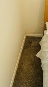 Visible damp patches in the master bedroom with high readings showing on the protimeter. This is how the bedroom was found originally.