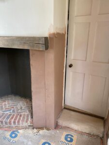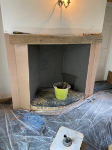 Visible damp patches around the fireplace area. This is how the front lounge was found originally.