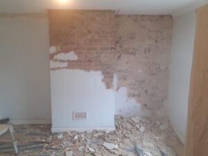 Mrs F of Tunbridge Wells contacted Prokil as she was concerned about dampness on the interior walls. The property was built in 1895 and was originally part of a row of terrace houses but the house next door was damaged from bombs during the was and is no longer standing. The previous interior wall adjoining the other house became an external wall and was rendered.