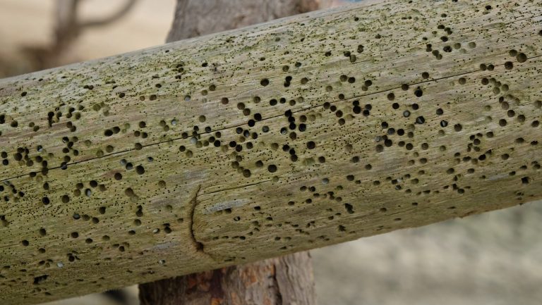 - Small, round holes on the surface of the wood